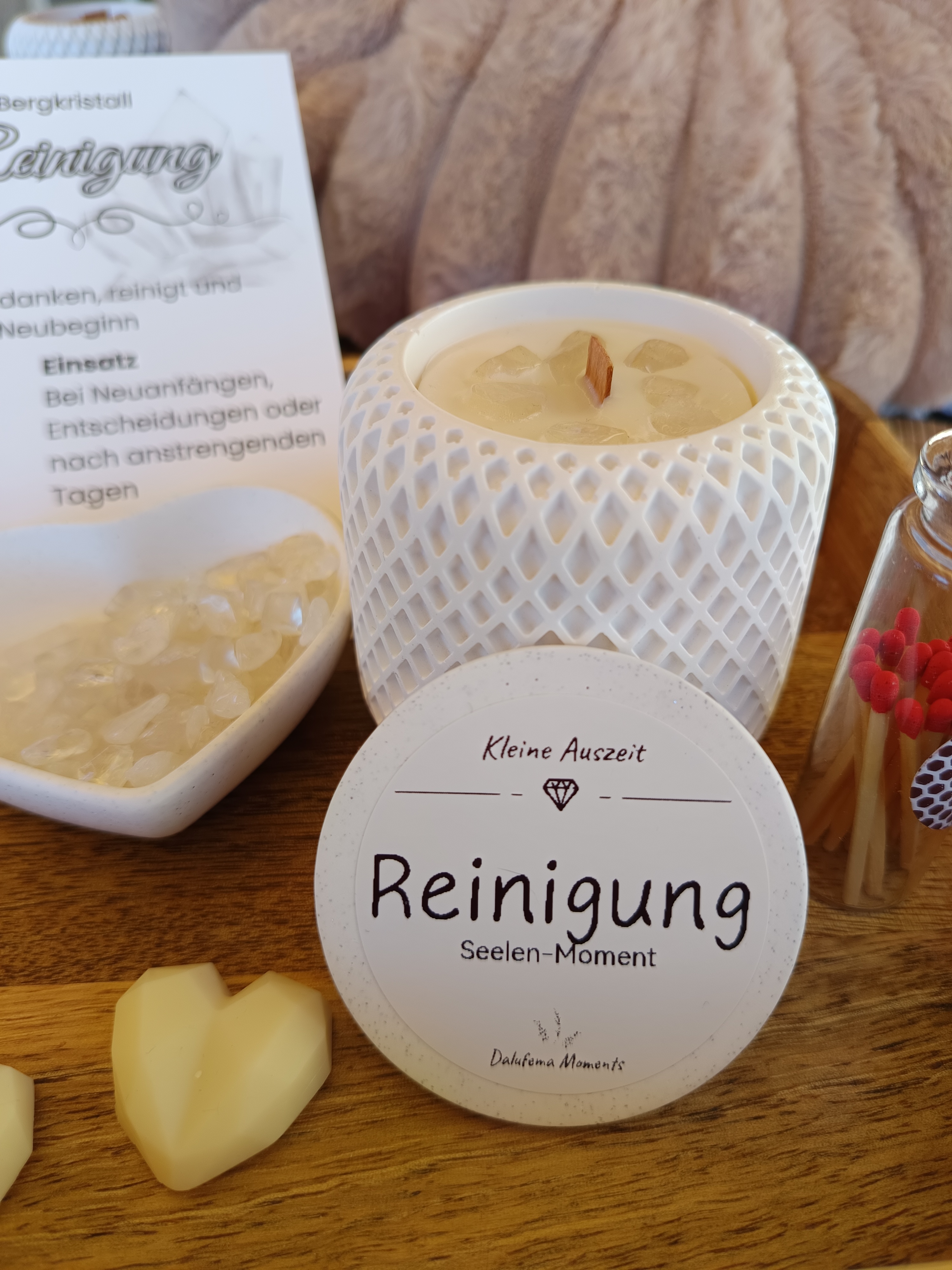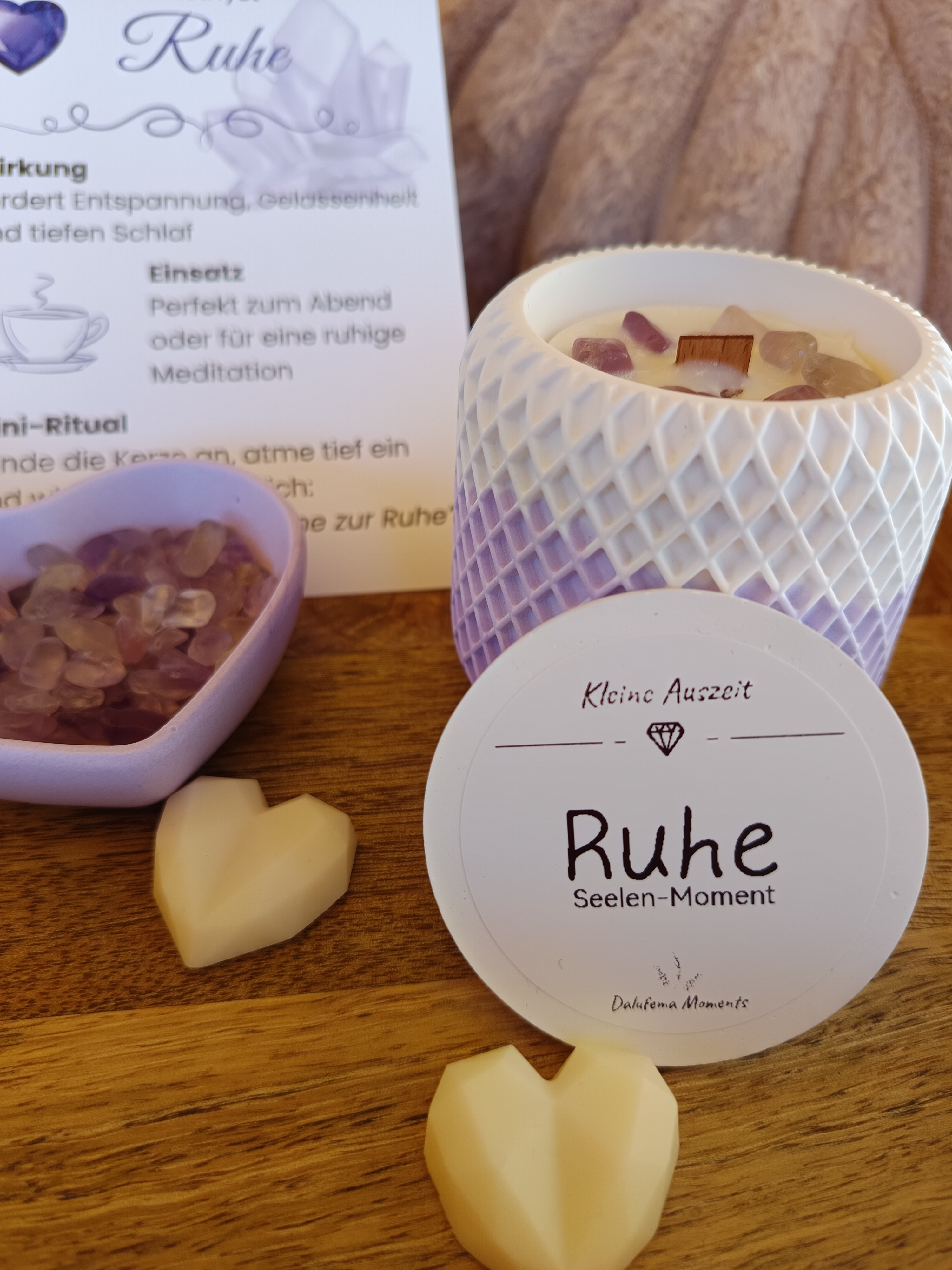 Jedes Licht entsteht in einem handgegossenen Gefäß und trägt einen feinen Duft, der deinen Moment auf sanfte Weise unterstützt. Zu jeder Auszeit bekommst du außerdem eine kleine Ritualkarte, die dir zeigt, wie du diesen Moment bewusst für dich gestalten kannst.