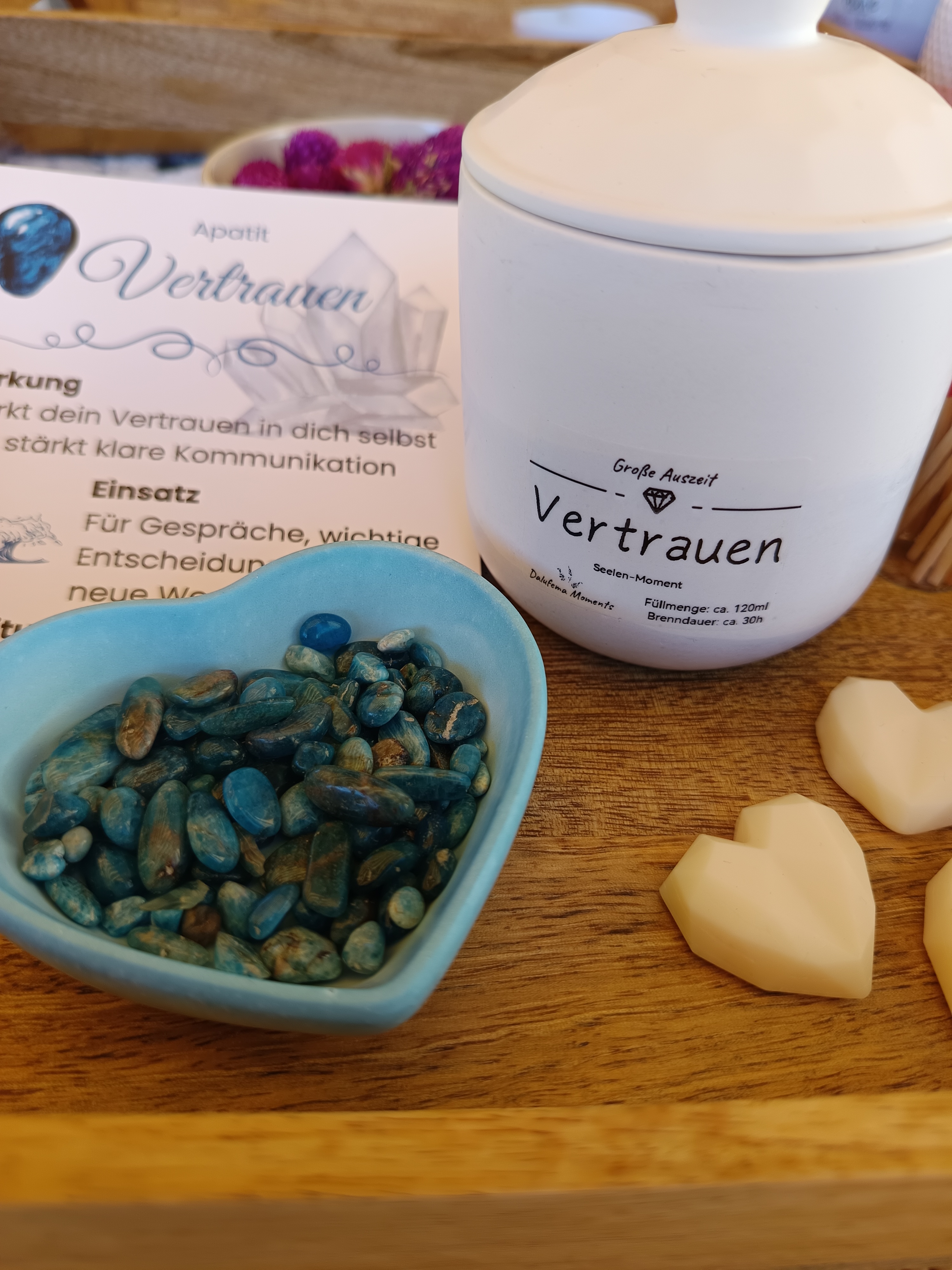 Vertrauen – blau/türkis mit feinem Duft nach Aloe Vera, enthällt kleine Apatit-Steine, sie wirkt besonders im Hals-Chakra und fördert Vertrauen, Selbstsicherheit und klare Kommunikation