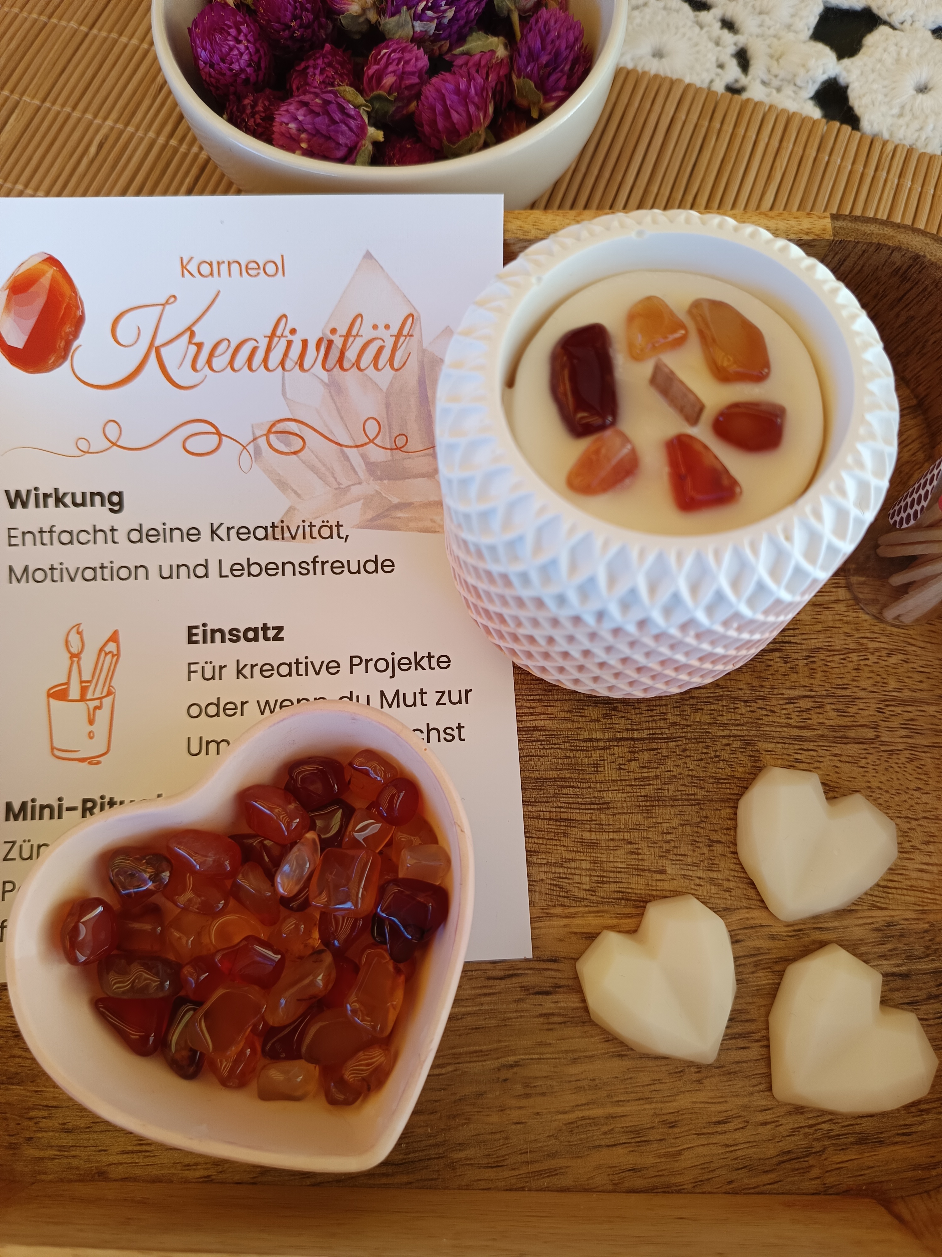 Kreativität – orange mit feinem Duft nach Zitrone-Basilikum-Mandarine, enthält kleine Karneol-Steine, sie wirkt besonders im Sakral-Chakra und fördert Kreativität, Mut und Energie