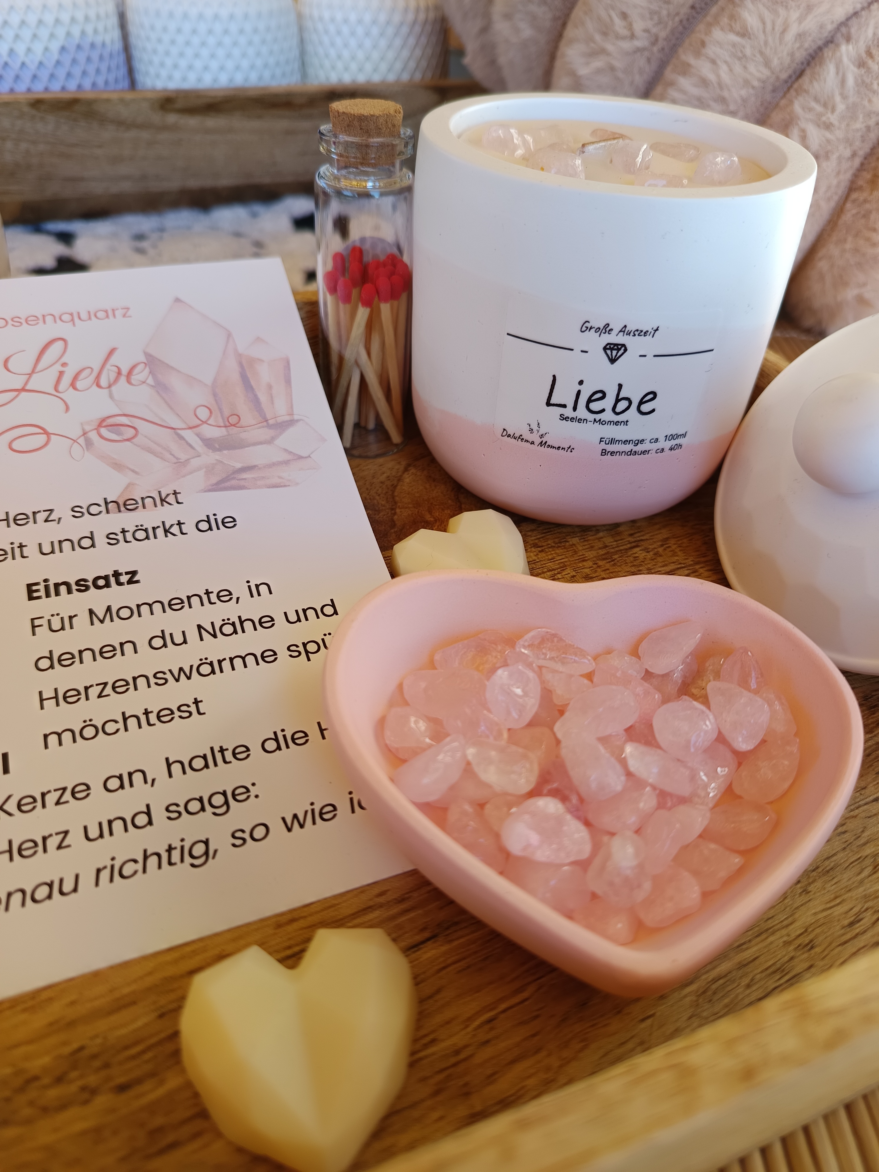 Liebe – rosa mit feinem Duft nach Frizzante & Rose, enthält kleine Rosenquarz-Steine, sie wirkt besonders im Herz-Chakra und fördert Herzöffnung, Geborgenheit und Selbstliebe