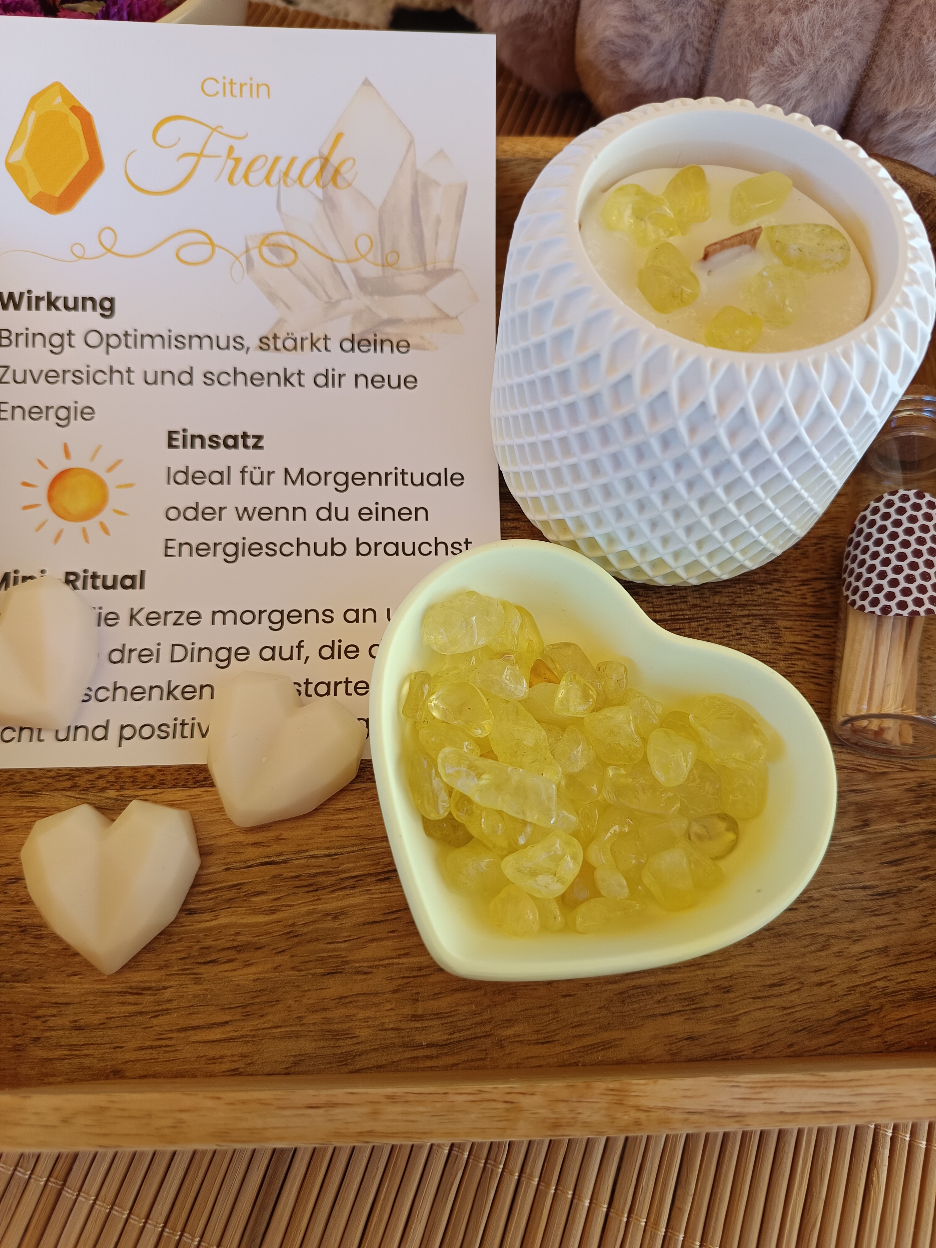 Freude – gelb mit feinem Duft nach Salted Grapefruit, enthällt kleine Citrin-Steine, sie wirkt besonders im Solarplexus-Chakra und fördert Optimismus, Zuversicht und Energie