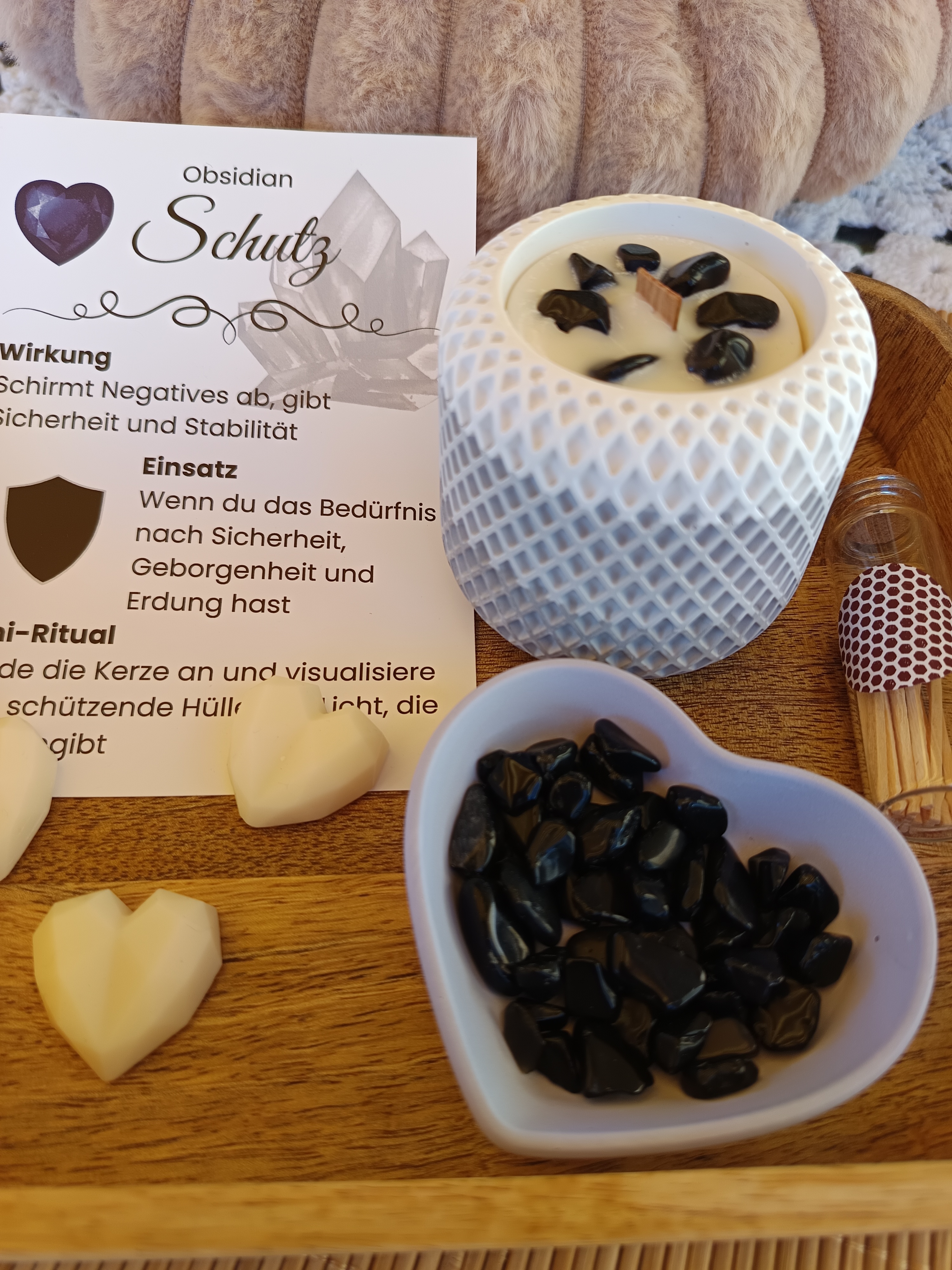 Schutz – schwarz/grau mit feinem Duft nach Sandelholz, enthält kleine Obsidian-Steine, sie wirkt besonders im Wurzel-Chakra und fördert Schutz, Stabilität und Abgrenzung